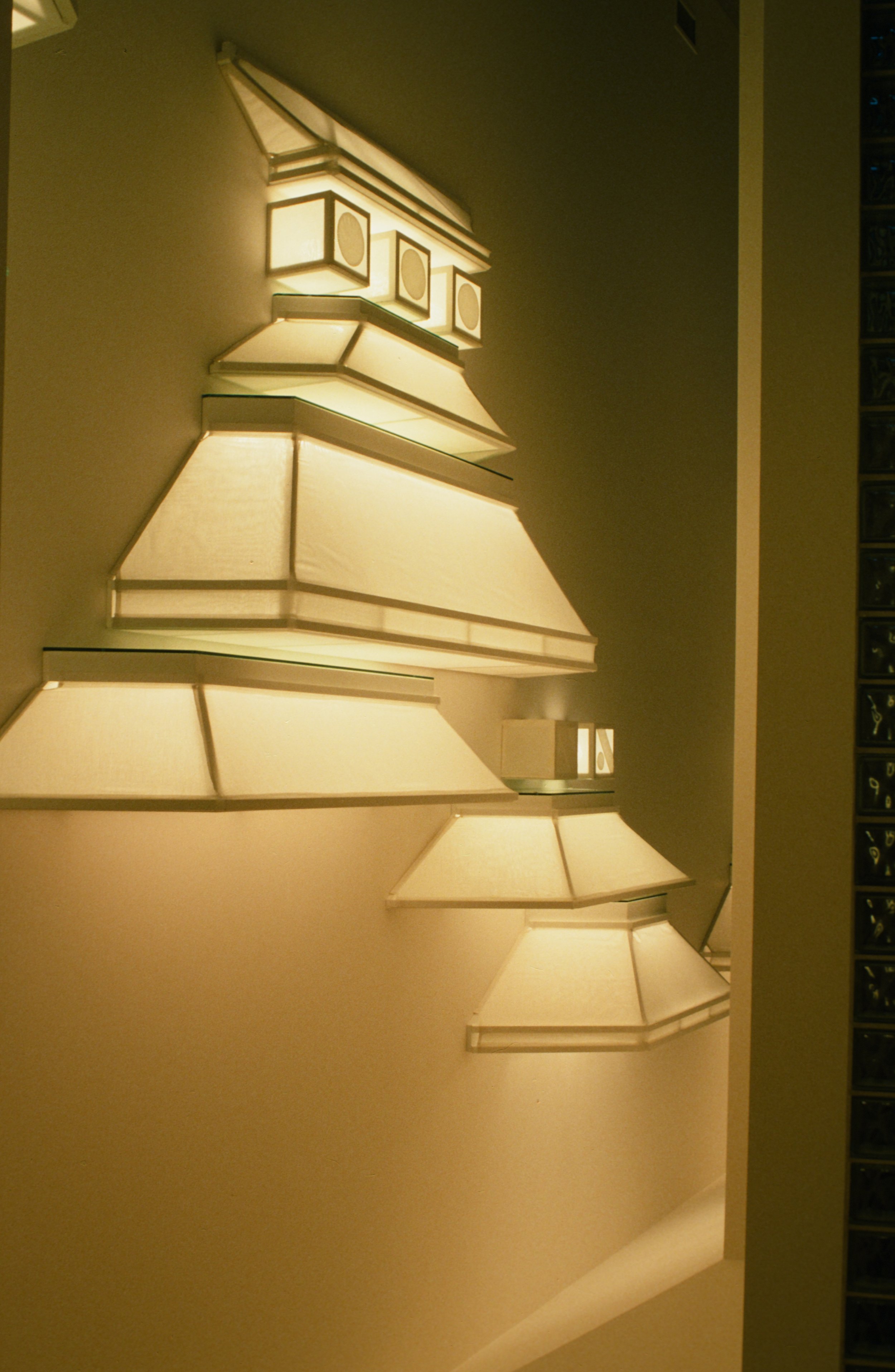The magnificent site of the Brillstein residence on the Malibu beach inspired flowing wave patterns created in glass, itself a super cool liquid. A 24’ high wall of glass surrounds a courtyard and makes the transition from entry to the grand room over looking the Pacific Ocean. The undulating wave pattern created by an art installation of shattered glass in the insulated window panels call attention to the coming view of the Ocean. It is as thought the waves are extending their greeting. The art windows cast an ever changing shadow pattern on the entry hall wall during the course of the day. The shadow painting is framed by sconces installed as a wave of light. The glass wall opens onto a courtyard lane pool. A bench of marble is supported by illuminated glass columns rising out of a glass floor and backed by a glass art window. The work appears as a “Frozen Fountain”. During the day the work dances with the sunlight responding in form to the action of the Pacific just beyond and in the evening glows as though from mysterious sources of light under and behind surfaces.